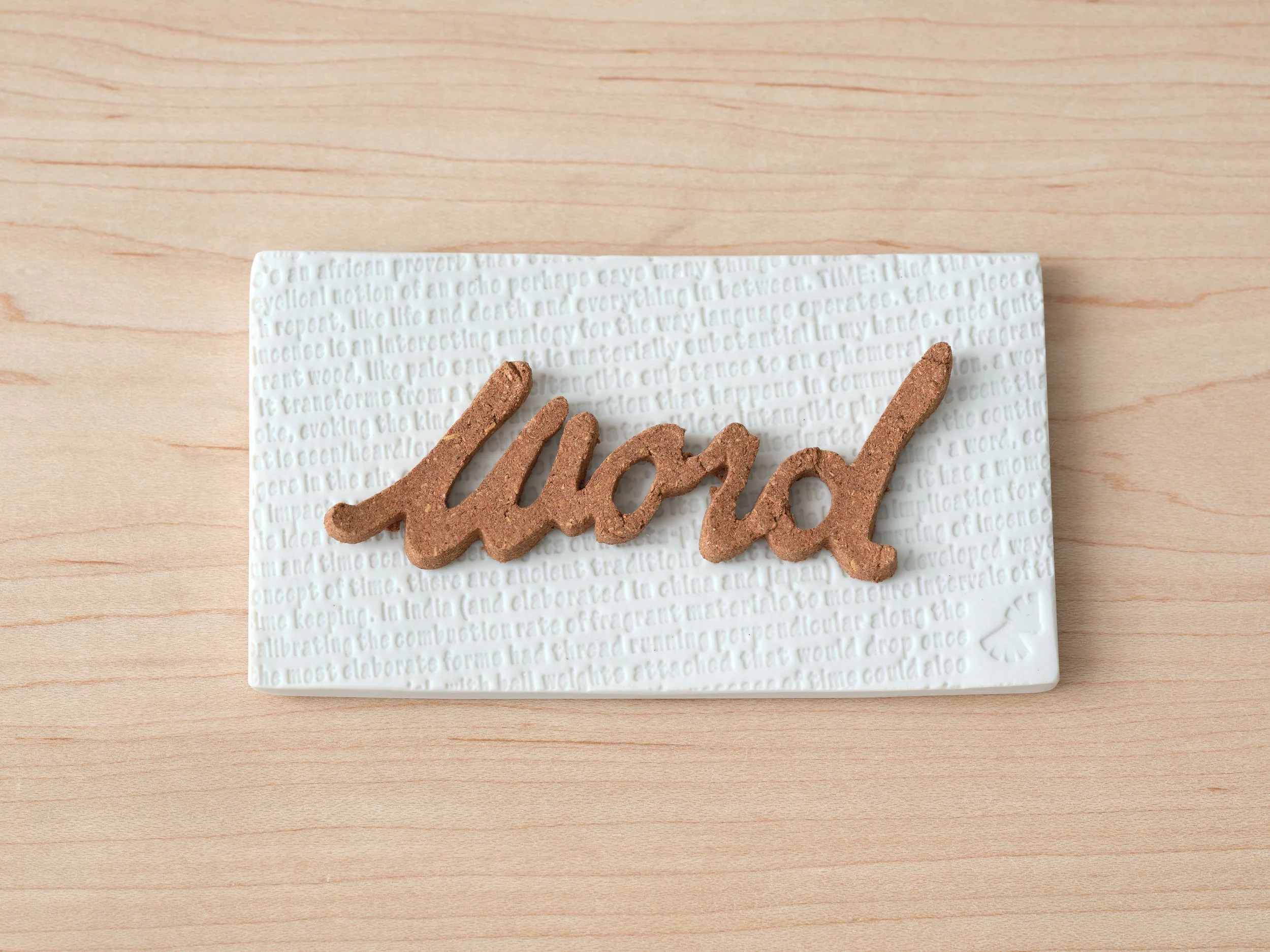 • One hand-embossed porcelain ash plate, featuring text excerpted from an essay by Kenturah Davis