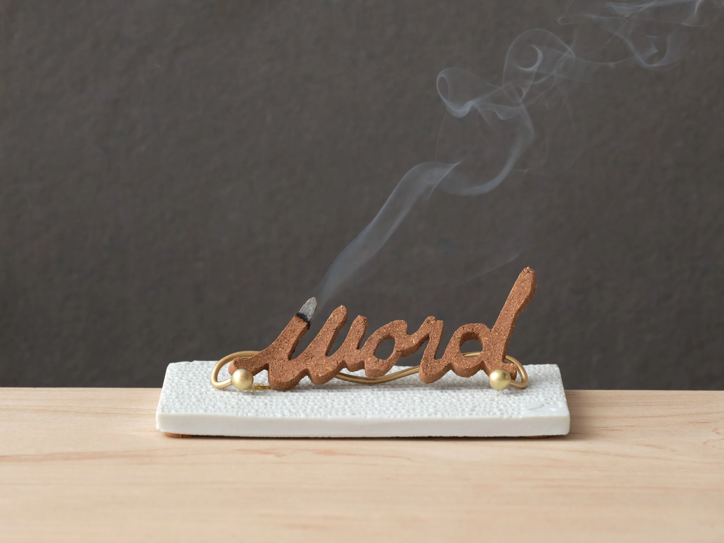 To activate, place brass stand on ash plate (prongs down, flat bar up). Light incense, rest against stand, and burn as desired.